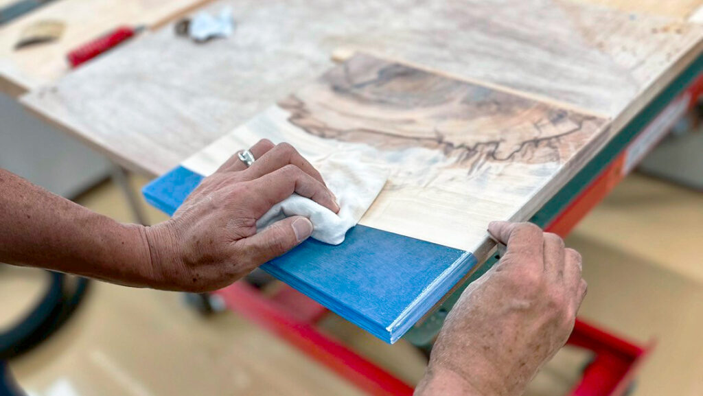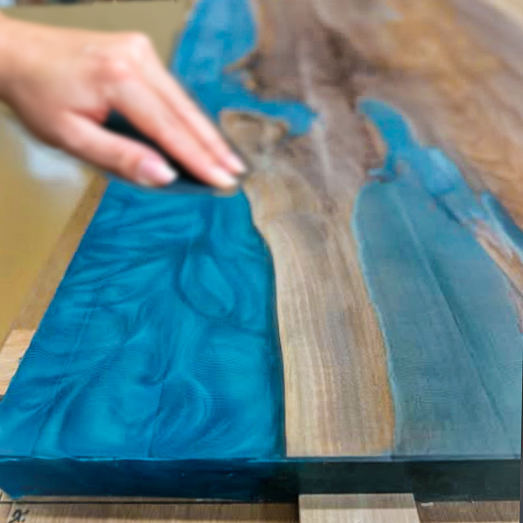 美しい透明感と滑らかな質感を実現するため、専用の機材を使って一つひとつ丁寧に仕上げています。レジンの気泡を丁寧に取り除き、木材との境界を美しく研磨することで、長くお使いいただける品質をお届けできるよう心がけています。表面の手触り、角の柔らかさ、細かな調整は手の感覚を頼りに整えています。