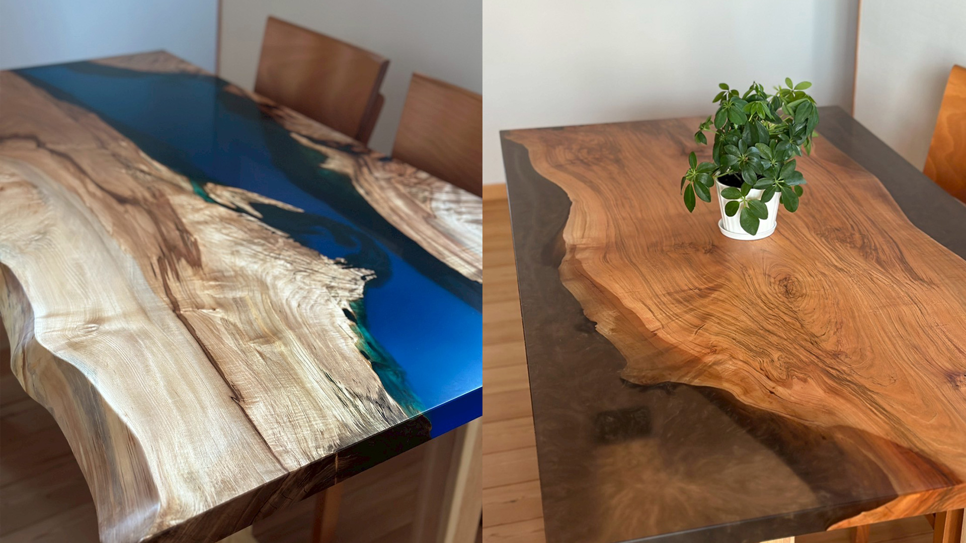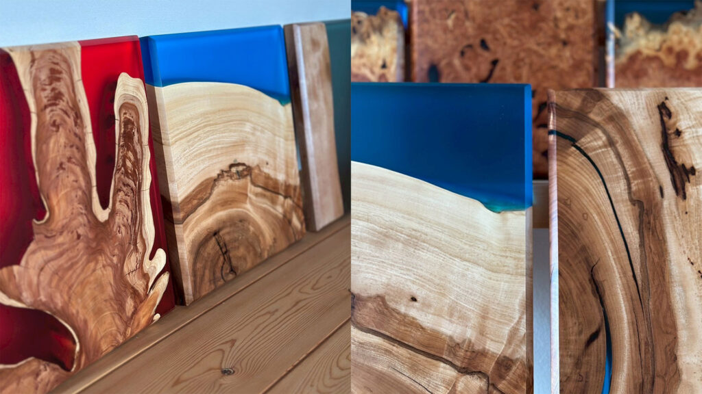 天然木が持つ節や割れ、自然な風合いに、エポキシレジンの透明感を重ね合わせることで、木材に新しい表情が生まれます。それぞれの木が歩んできた時間を大切にしながら、現代の技術と融合させて、あなたの暮らしに寄り添う特別な一点をお作りしています。